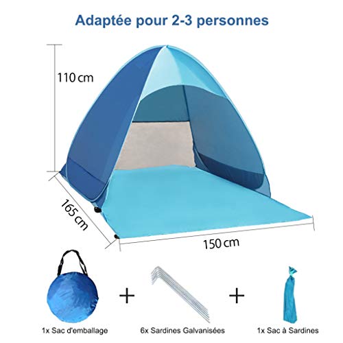 Specification: QcoQce Tente Anti UV, Abri de Plage avec Protection Solaire UV UPF 50+ pour 2-3 Personnes,Tente de Plage Instantanée Portable Escamotable, Comprend Un Sac de Transport et des Piquets de Tente