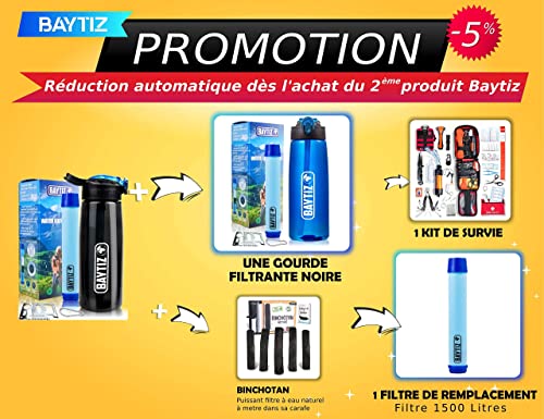 Specification: BAYTIZ ® Gourde Filtrante + Paille de Survie au Charbon Actif – Bouteille Filtre à Eau Nomade : Voyage Randonnée Trek Camping Kit Purificateur Réutilisable + Boussole Plastique Sac Pluie Catastrophe