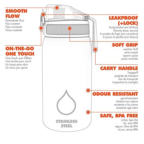 Une bouteille d’eau 100% étanche, 400ml (13oz) sans odeur pour les enfants, facile à ouvrir avec une finition métallique brillante. Avec un bec décentré et une inclinaison minimale, vous pouvez voir et continuer à bouger pendant que vous buvez, tandis que l’anneau de transport vous permet de l’accrocher à un doigt, à un crochet ou à un mousqueton. La petite bouteille d’eau parfaite pour l’école, les boîtes à lunch, la voiture, le bureau ou pour un usage général en déplacement. Ouvrez ces bouteilles d’une main avec une seule touche et fermez-les pour plus de tranquillité d’esprit lorsque vous les jetez dans un sac. Fabriquée en acier inoxydable, cette bouteille de boisson polyvalente est résistante aux odeurs, facile à laver à la main et garde les boissons fraîches et pleines de saveur.