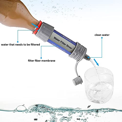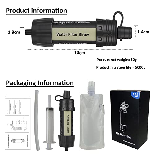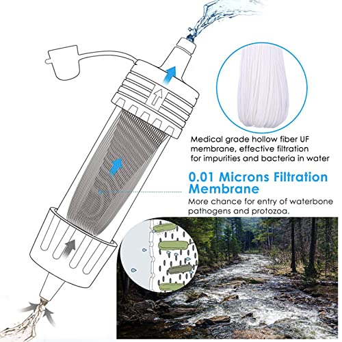 Specification: Filtre Eau Personnel, Filtre à Eau Extérieur Système de Filtration Purificateur d’eau 99,9% des Bactéries Filtre à 0,01 Microns Paille Eau Portable Kit de Survie pour Randonnée Camping Backpacking