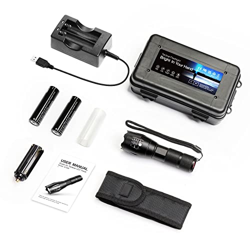 【Set Portable】 1 x Ultra Puissante LED Lampe Torche, 2 x batteries rechargeables, 1 x chargeur rapide USB, 1 x tube à piles, 1 x support pour piles AAA et 1 x étui pour Lampe Torche. Tout est dans une seule boîte, facile à transporter. La lampe torche rechargeable de haute qualité avec une belle boîte est le choix parfait comme cadeau.