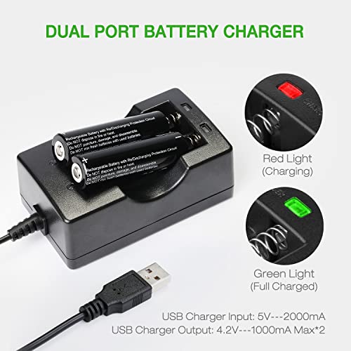 【Chargeur USB et 2*2000mAh batteries】2 pièces batteries rechargeables et un chargeur de batterie USB à double port inclus. La batterie de haute qualité est parfaitement contre la surchauffe et les fuites, vous permettant de charger et d’utiliser en toute sécurité. La LED lampe torche fournit 8 heures en mode élevé et charge complètement les piles en 5 heures.