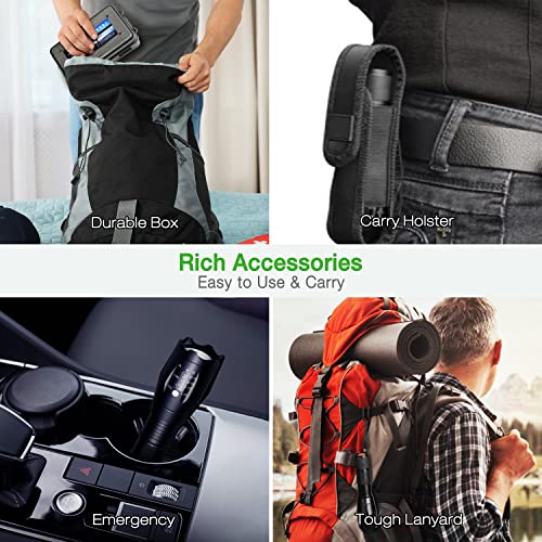 【Lampe Torche LED Ultra Puissante】 La LED lampe torche haute efficacité de 3000 lumens peut facilement éclairer toute la pièce ou se concentrer sur des objets à 300 mètres, ce qui est plusieurs fois plus lumineux que les lampes de poche ordinaires. La LED lampe de poche rechargeable compacte peut être placée dans une poche ou un sac à dos, parfaite pour les activités de plein air, la randonnée, le camping, les urgences.
