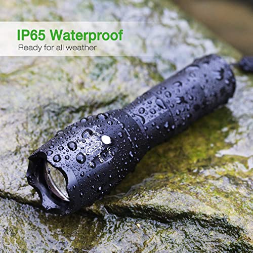 【IP65 Imperméable et robuste】La LED lampe torche est faite d’alliage d’aluminium de haute qualité avec un anneau en caoutchouc étanche qui peut être imperméable. La lampe torche puissante peut être utilisée dans des environnements difficiles. Solide et durable assez pour jusqu’à 100 000 heures de temps de travail.