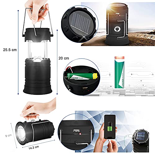 XVZ Lanterne de Camping Solaire Rechargeable, Lampe de poche portable – Rechargeable USB et micro port – Étanche IPX4 -pour Tente, Randonnée, Urgence, Coupures de Courant (noir)