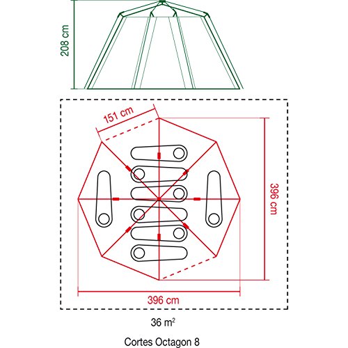 The Cortes Octagon 8 Green provides a full 360° view of your surroundings. Ample living space and the ingenious hinged door gives it a homely feel on the campsite. This spacious tent has a multitude of uses, it can be dressed as luxury glamping bedroom, a playroom for the kids or a perfect tent for festival gatherings. The tent comes with a wheeled carry bag and packs down compactly for easy transportation and storage. Features and Specification Capacity: 8 Persons Rooms: none Sleeping area: 15,7m² Living area: -m² Total area: 15,7m² Set up: Inner first Poles: Steel Groundsheet: PE Integrated Fabric: Polyester, PU coated Seams: Taped seams Carry bag: Included Pack Size: 85 x 30 x 30cm Weight: 20,7kg Water column: 2000mm Weather Tech offers comfort and protection well enjoying the outdoors meaning this tent is waterproof Hinged door means its easy to get in and out of the tent Fire Retardant