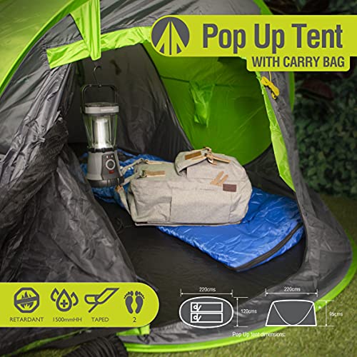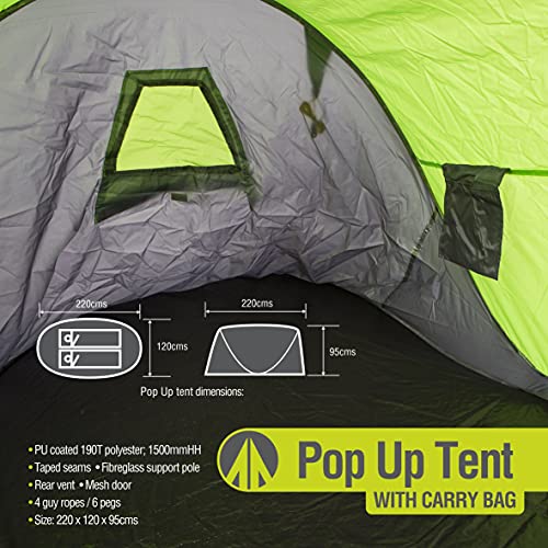Tente pop-up pour 2 personnes : cette tente pop-up pour 2 personnes mesure 220 x 120 x 95 cm. S’adapte facilement à un tapis de camping double et deux personnes. Couleur vert anis.