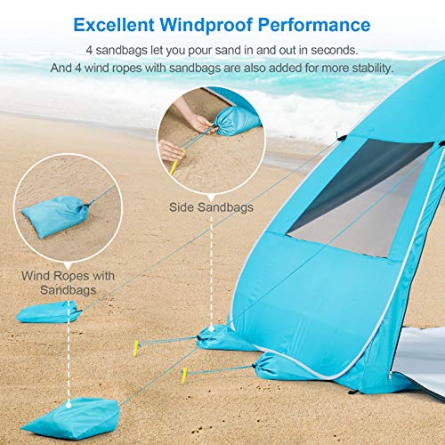 Versatilité: En haut de la tente, il y a un crochet pour suspendre une petite lampe ou un petit ventilateur. Aussi, des deux côtés de la tente en dessous des fenêtres se trouvent deux poches de rangement en maille pour ranger téléphone portable, magazine, serviette ou autres effets personnels.Non seulement elle est parfaite pour les activités de la plage, mais aussi pour le parc, la cours arrière, la pêche, les événements sportifs, les festivals musicaux ou pour les voyages de fin de semaine.