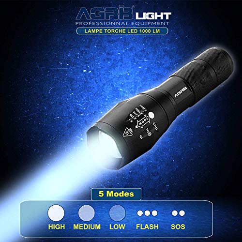 ✔️ ULTRA PUISSANTE / DURABLE : La lampe de poche puissante Agrib Light permet un éclairage longue portée de 1000 lumens et une utilisation quotidienne pendant de longues années. Véritable condensée de technologie, vous pouvez Illuminer facilement une pièce entière ou cibler des objets avec précision. 5 modes d’éclairage disponibles: Haut / Moyen / Bas / Stroboscope / SOS.