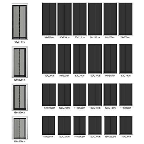 Taille flexible, peut être découpée: La taille d’origine du rideau de porte est de 90x210cm, ce qui signifie qu’il peut être utilisé pour une taille maximale de cadre de porte de 86x208cm. Il peut être coupé en cinq tailles : 80x210cm, 70x210cm, 90x200cm, 80x200cm et 70x200cm. Lors de l’installation, veuillez relever la position médiane du haut du rideau de 1 à 2 cm pour assurer une bonne fermeture.